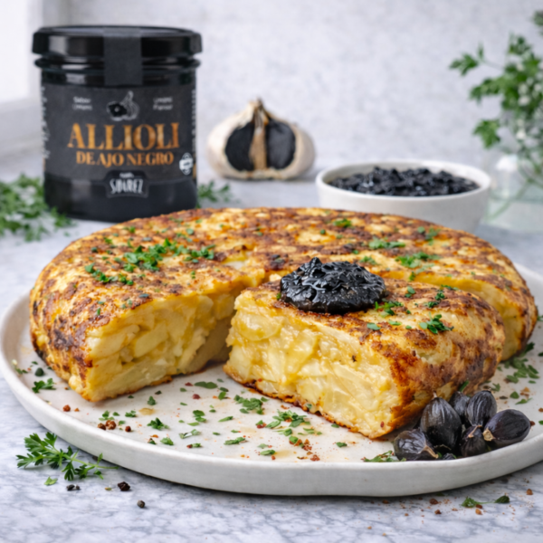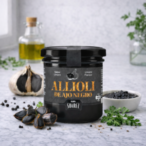 L’aïoli à l’ail noir Familia Suárez est une sauce d’exception qui revisite un grand classique méditerranéen avec élégance et modernité. Élaboré à partir d’ail noir soigneusement fermenté, cet aïoli se distingue par sa douceur, sa rondeur et sa richesse aromatique unique.
