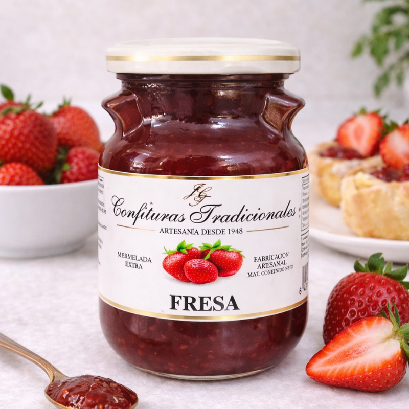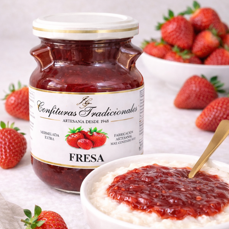 La confiture artisanale de fraise Confituras Tradicionales est élaborée selon un savoir-faire traditionnel, à partir de fraises soigneusement sélectionnées pour leur maturité, leur parfum et leur richesse aromatique.