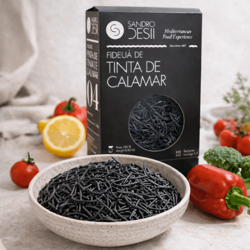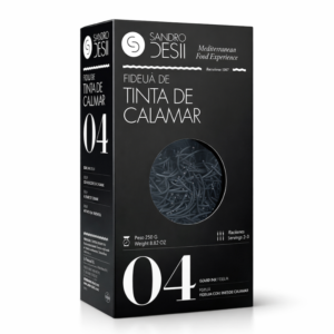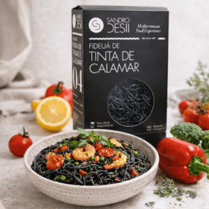 La fideuà à l’encre de calamar Sandro Desii revisite avec élégance un grand classique de la cuisine méditerranéenne. Élaborée à partir de pâtes de blé dur de qualité supérieure et enrichie à l’encre de calamar, elle se distingue par sa couleur noire intense et son profil aromatique unique.