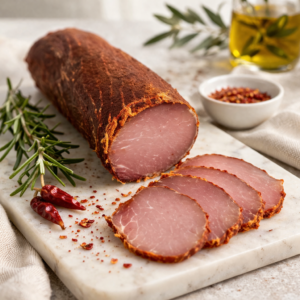 Élaboré à partir de porc rose soigneusement sélectionné, ce filet mignon séché au piment d’Espelette DOP est une véritable invitation au voyage entre terroirs français et savoir-faire artisanal espagnol.