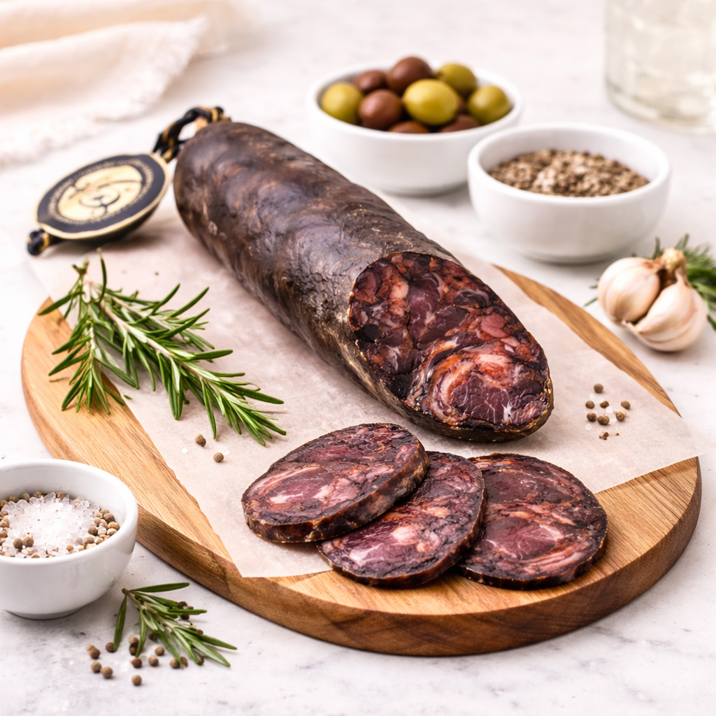 Sélectionné avec soin, le filet est salé avec précision puis délicatement enrobé d’un mélange d’herbes aromatiques — thym, romarin et autres notes méditerranéennes — avant d’être lentement affiné en séchoirs naturels. Ce temps de maturation permet à la viande de se raffermir tout en conservant son moelleux.