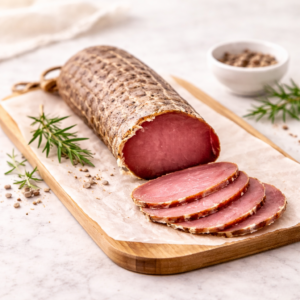 À la coupe, la tranche révèle une chair rosée, maigre et régulière, délicatement entourée d’un voile d’herbes séchées. Le nez est frais et aromatique. En bouche, l’attaque est tendre, presque soyeuse, laissant place à des notes végétales élégantes qui prolongent la douceur naturelle de la viande. L’équilibre entre fraîcheur herbacée et finesse carnée est parfaitement maîtrisé.