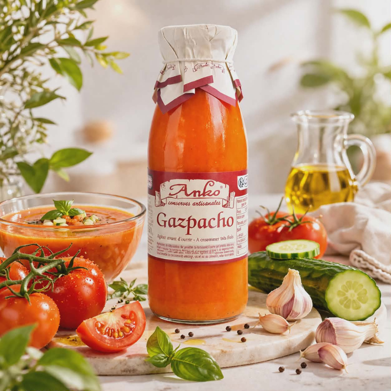 Plongez dans la fraîcheur ensoleillée du Gaspacho "classique" Anko, une recette intemporelle sublimée par un savoir-faire artisanal. Chaque cuillerée révèle l’équilibre parfait entre la douceur des tomates gorgées de soleil, la vivacité du poivron et la finesse du concombre, délicatement relevés d’une pointe d’ail et d’huile d’olive.