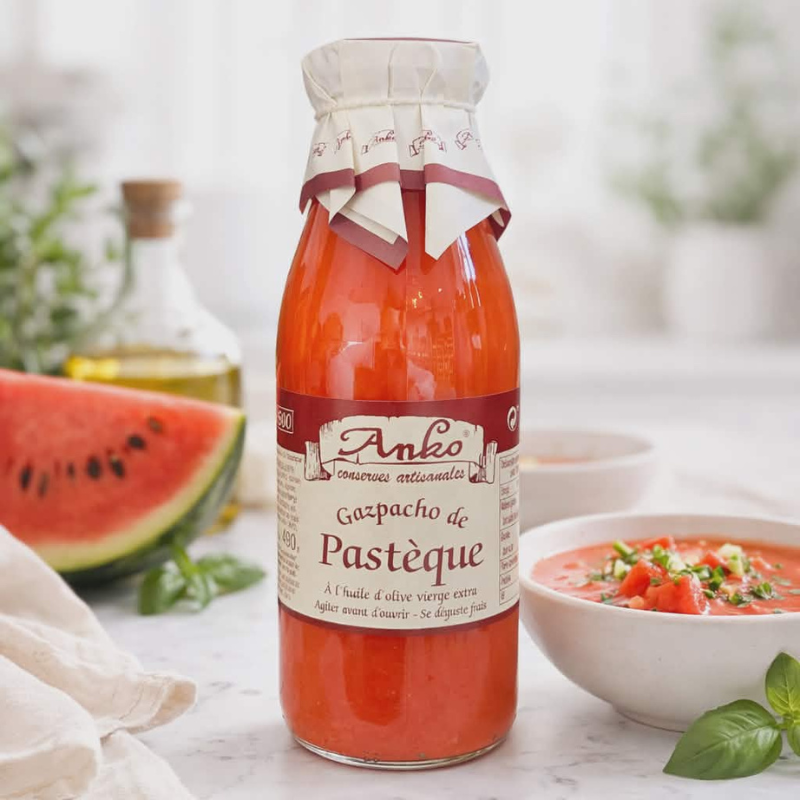 Laissez-vous surprendre par l’alliance délicate et ensoleillée du gaspacho tomate & pastèque Anko. Cette création originale revisite le classique avec une touche de douceur fruitée, où la tomate mûrie au soleil rencontre la fraîcheur désaltérante de la pastèque.