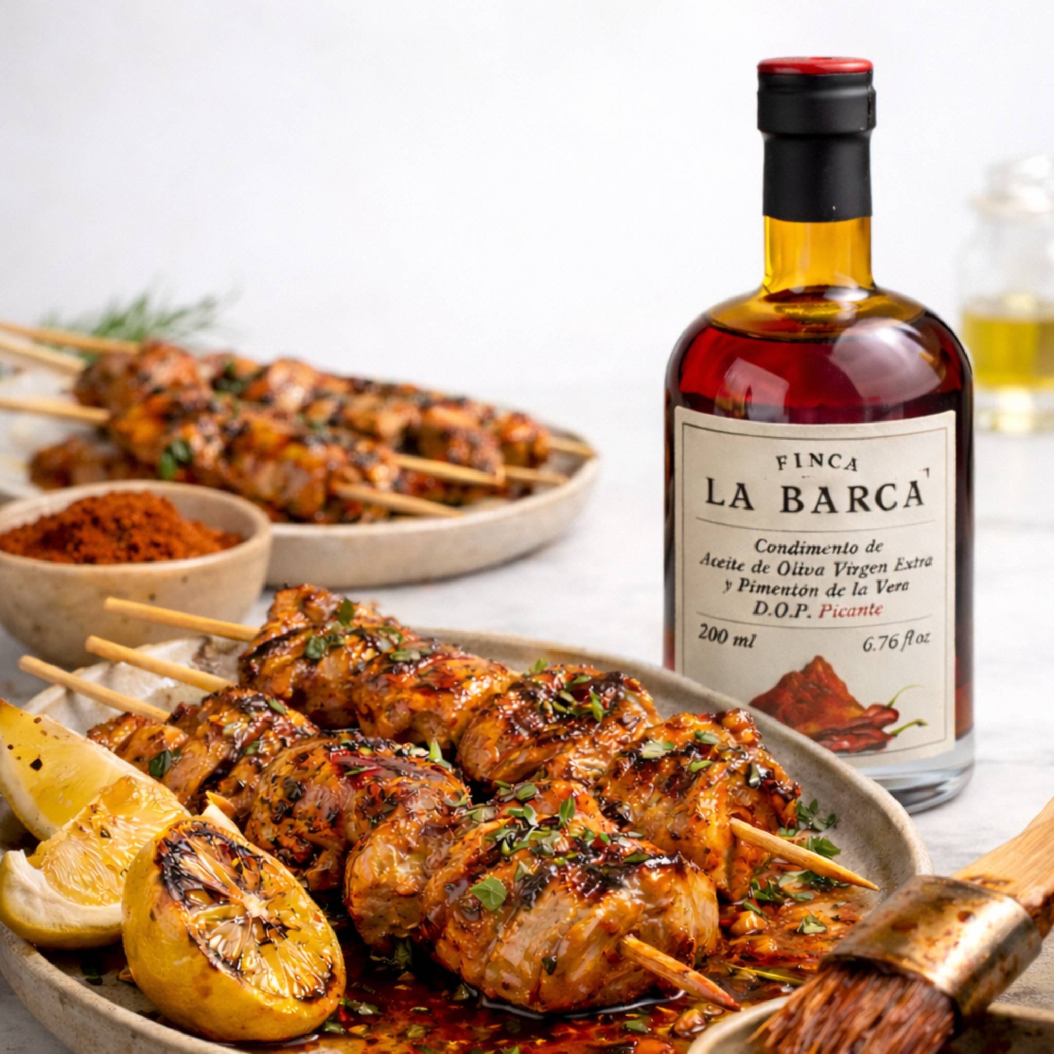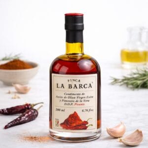 L’huile d’olive extra vierge au Pimentón de la Vera pimenté Finca la Barca est une spécialité emblématique d’Espagne, née de la rencontre entre une huile d’olive de grande qualité et l’un des trésors gastronomiques d’Estrémadure.
