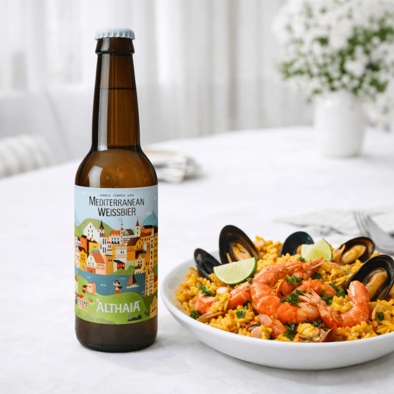 La Mediterranean Weissbier est brassée par la Brasserie Althaia, située sur la côte méditerranéenne espagnole. Inspirée du style bavarois Weissbier (bière de blé), elle met en avant une forte proportion de malt de blé, qui lui confère sa texture souple et son aspect légèrement trouble.