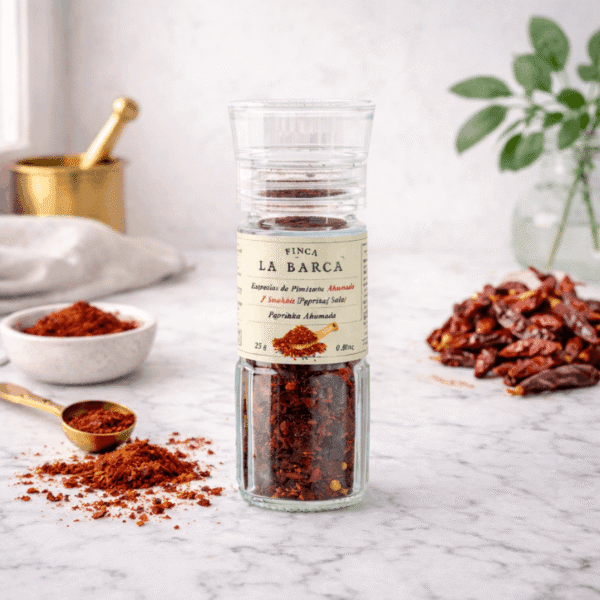 Le Pimentón - version moulin offre toute l’intensité et l’authenticité du Pimentón dans un format pratique et élégant. Les poivrons, séchés lentement au feu de bois de chêne, sont présentés sous forme de flocons à moudre, permettant de libérer les arômes fumés au dernier moment.