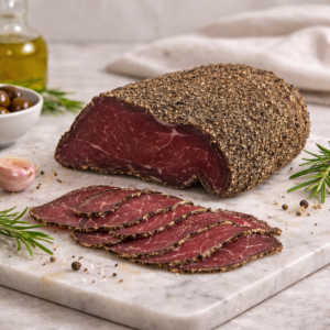 Salée puis lentement affinée, elle est enrobée d’un poivre aromatique qui vient subtilement relever la douceur de la viande. Le résultat : une charcuterie authentique, à la fois fondante et parfumée, où chaque tranche révèle un bel équilibre entre notes épicées et saveur naturelle du porc.