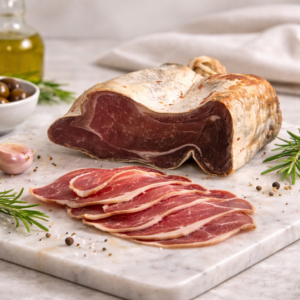 Travaillée avec sobriété, cette charcuterie est uniquement salée puis lentement affinée en séchoirs naturels. Le temps agit comme unique allié, permettant à la viande de développer sa texture ferme et fondante, ainsi qu’une concentration aromatique naturelle, sans artifices.