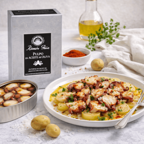 Le poulpe à l’huile d’olive Ramón Peña est une spécialité emblématique de la haute conserverie galicienne, reconnue pour son exigence et son respect du produit. Sélectionné avec soin pour sa qualité et sa fraîcheur, le poulpe est préparé entièrement à la main, puis cuit avec précision afin d’obtenir une texture tendre et fondante, jamais caoutchouteuse.