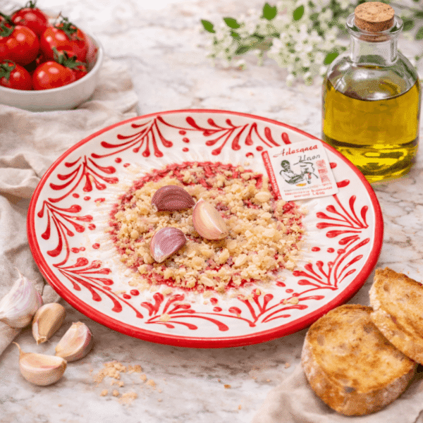 Fabriquée en céramique artisanale, cette assiette est dotée d’une surface texturée spécialement pensée pour râper légèrement une gousse d’ail. Il suffit ensuite d’ajouter un filet d’huile d’olive pour obtenir une base parfumée idéale, à appliquer directement sur du pain, des tomates, des légumes ou des viandes.