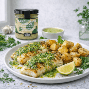 Sauce Mojo Picón Verde, typique des îles Canaries, fraîche et aromatique. Une sauce aux herbes, à l’ail et aux épices, idéale pour accompagner poissons, légumes et plats méditerranéens.