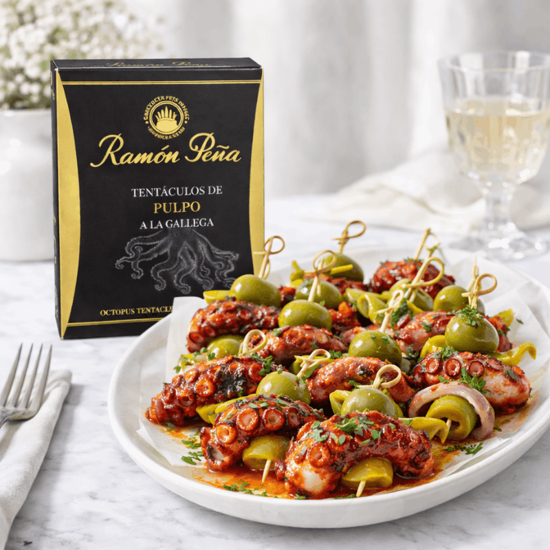 Les tentacules de poulpe à la galicienne en sauce paprika Ramón Peña sont une expression raffinée du célèbre pulpo a la gallega. Sélectionnées pour leur qualité et leur calibre, les tentacules sont préparées entièrement à la main, dans le respect du savoir-faire artisanal galicien.